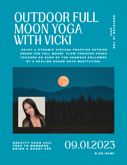 Featured September 1, 2023 @ 6:30 pm - 8:00 pm Full Moon Yoga Focused on the Chakras with a Sound Bath Meditation Gravity Haus 352 Meadow Drive, Vail, Colorado Full Moon Yoga on the Gravity Haus Deck